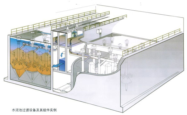 這種類型的過濾器安裝時,所有過濾單元(每個單元由多個過濾組件組成)公用一個砂床。一套設(shè)備實質(zhì)上沒有過濾面積限制,因此活性砂過濾器可以應(yīng)用在處理相當(dāng)于10萬或更多人口用水的大型水廠和污水處理廠。